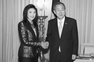 11月16日,泰国总理英拉(左)与到访的联合国秘书长潘基文在曼谷握手。 当日到访的潘基文在位于曼谷的泰国总理府回答记者提问。潘基文说,“从这次超级洪水中吸取教训极为重要。更好地做好应对灾难的准备,减少灾害带来的风险,可以挽救许多生命,减少财产损失”。泰国50年不遇的洪水自7月以来已经造成至少564人死亡。新华社发