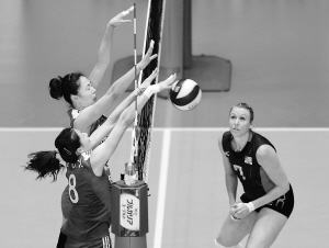 | 中国女排队员魏秋月(前左)与队友在比赛中拦网。 新华社发 |
