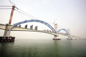 11月16日,中国铁建二十二局集团负责建设的铁路桥——广珠铁路西江特大桥顺利合龙。新建广州至珠海铁路全长189.376公里。这是一条双线货运铁路,计划于明年通车,建成后将成为珠三角的一条铁路大动脉。 新华社发(孔祥文摄)
