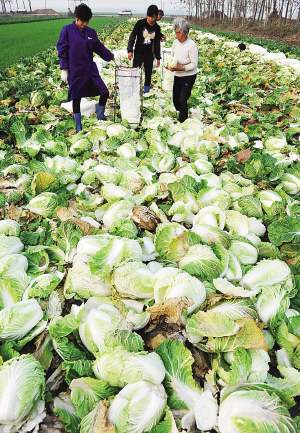 尽管当地政府已通过组织蔬菜合作社与大型超市及卖场进行农超对接,并引导蔬菜加工企业进行收购,但由于供大于求,怀远大白菜的销售价格只能维持在每斤0.07元左右。据当地农民介绍,一亩地能够收获7000斤大白菜,按照每斤0.07元的价格,今年一亩地大白菜的总收入大概在500元左右,而种植一亩大白菜所需种子、肥料、农药等成本却超过500元。