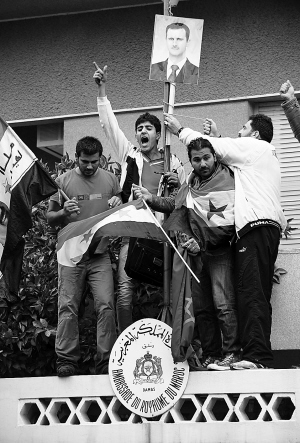 | 十一月十六日,在叙利亚首都大马士革,示威者爬上摩洛哥驻叙利亚大使馆的门墙。当日,数十名支持政府的示威者在摩洛哥驻叙利亚大使馆外集会,并向使馆楼房投掷鸡蛋和苹果。 新华社记者 殷博古 摄 |