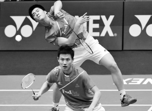 11月17日,在香港公开羽毛球锦标赛男双比赛中,中国选手蔡赟(前)/付海峰获胜晋级下一轮。 新华社发