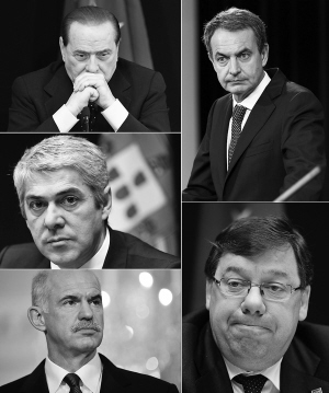 在11月20日举行的西班牙大选中,反对党人民党获得压倒性胜利,拉霍伊将接替萨帕特罗出任西班牙新首相。至此,遭遇欧洲债务危机打击或侵袭的爱尔兰、葡萄牙、希腊、意大利和西班牙都实现政府更迭。但是,换人更要治本,才能根本解决问题。 组图为:意大利前总理贝卢斯科尼(左上)、葡萄牙前总理苏格拉底(左中)、希腊前总理帕潘德里欧(左下)、即将卸任的西班牙首相萨帕特罗(右上)和爱尔兰前总理考恩(右下)。 新华社发
