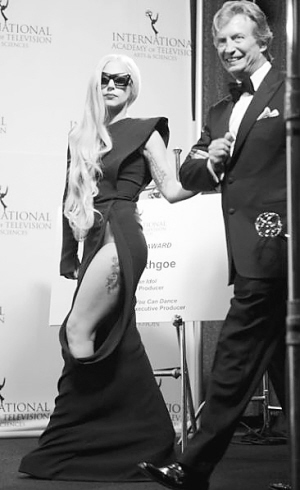 颁奖仪式上,一袭黑裙的美国歌星嘎嘎小姐为综艺节目《美国偶像》的制片人、来自英国的奈杰尔·利思戈颁发象征国际艾美奖最高荣誉的“创始人奖”,引起歌迷阵阵尖叫。