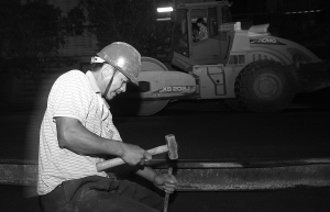 两台大太阳灯远远照过来,压路机缓缓开过去,六七名工人在铺设着钢模板。今晚8时许,在琼海市嘉积镇豪华路改造施工现场,人们仍在忙碌着。