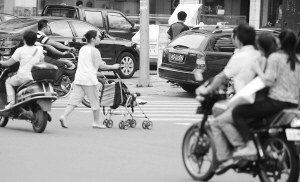 11月22日,三亚市解放路,一推童车妇女对几米外的斑马线视而不见,穿行于机动车交叉路口。 本报记者 苏建强 摄