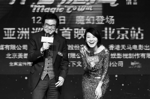 | 11月23日,青春魔幻电影《开心魔法》在北京举行“亚洲巡回”启动仪式,图为黄百鸣和闫妮(右)在发布会上。 新华社发 |
