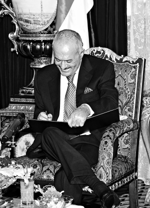 | 这张沙特通讯社11月23日提供的照片显示,也门总统萨利赫在沙特阿拉伯首都利雅得签署调解协议。 新华社/法新 |