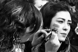 11月24日,在叙利亚首都大马士革,参加声援政府集会的叙利亚妇女在脸上画上国旗。 新华社发(巴西姆摄)