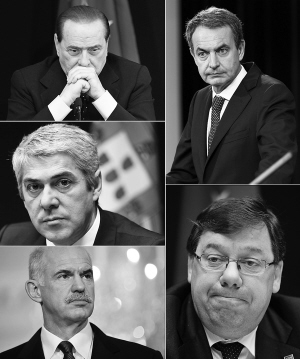 随着西班牙人民党在大选中获胜,欧债危机核心的葡萄牙、爱尔兰、意大利、希腊、西班牙已全部换帅。这是意大利前总理贝卢斯科尼(左上)、葡萄牙前总理苏格拉底(左中)、希腊前总理帕潘德里欧(左下)、即将卸任的西班牙首相萨帕特罗(右上)和爱尔兰前总理考恩(右下)的拼版照片。 新华社发