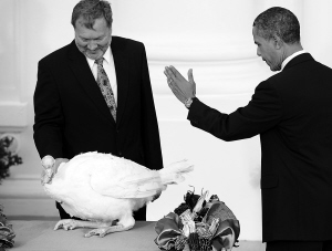 11月23日,在美国首都华盛顿白宫,美国总统奥巴马(右)赦免一只名为“自由”的火鸡。每年11月的第4个星期四是美国传统节日感恩节。按照习俗,美国总统每年都会在感恩节前夕在白宫赦免火鸡,使其免于成为感恩节大餐。美国总统特赦火鸡的传统始于杜鲁门总统时代。 新华社记者 张军 摄