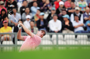→ 11月24日,第56届高尔夫世界杯第一轮四人四球赛中,新西兰选手迈克尔·亨德利在大力开球。 本报记者 张杰 摄 (更多报道见A7版)