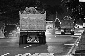 每当夜幕降临,载重卡车、泥头车等大型车辆开始上路。车辆行驶所发出的噪声以及刺耳的鸣笛声,严重影响了沿途居民的生活。 本报记者 古月 摄