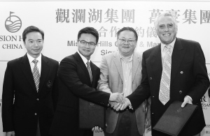 26日上午,观澜湖与万豪国际集团在海口举行签约仪式,双方将联手在观澜湖·海口国际高尔夫度假区兴建丽思卡尔顿酒店与万丽酒店。图为观澜湖集团主席兼行政总裁朱鼎健(左二)和万豪国际亚太区总裁兼董事总经理高思盟(右一)签署并交换了协议。小梁 摄