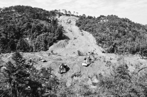 11月27日拍摄的事故现场。 11月26日下午3点30分许,在与广东郁南县接壤的苍梧县大坡镇马王村,因不法分子盗采稀土矿引发一起山体滑坡事故,当时有7名盗采人员在事故中失踪。 经过搜救人员连续奋战,目前已找到2名失踪人员遗体,余下5名失踪人员仍在紧张搜救中。3名涉嫌参与稀土盗采的当事人已被当地警方控制。 新华社发