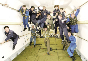 图为2004年12月17日,在俄罗斯首都莫斯科的加加林阿特拉斯宇航中心,10名中国游客在俄罗斯宇航员的保护之下体验太空失重训练的乐趣。他们不仅是该中心自1999年底开始商业旅游项目运行以来首批尝试太空失重实验训练的中国人,也是首个来自亚洲地区尝试这一训练的旅游团。 新华社发