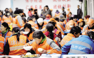 目前,乌鲁木齐现有公益性环卫保洁员1.9万名,其中,每天上早班的约有1.2万人,他们每天早晨6点就开始上岗工作。由于工作的时限性和特殊性,多数人早上只能啃点干馕,吃点凉饭,连热水都喝不上。随着严冬逼近乌鲁木齐,当地清除冰雪任务加重,这一问题更加突出。