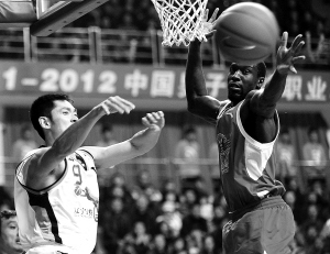 | 11月29日,在2011-2012CBA联赛第五轮比赛中,辽宁衡业队主场以91:87战胜山东黄金队。图为辽宁队球员张庆鹏(左)与山东队球员亨特(右)拼抢。