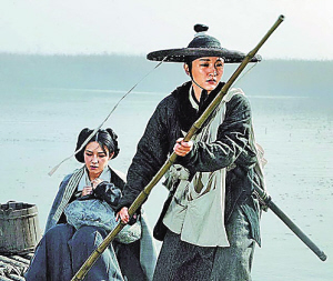 | 周迅(右)在《龙门飞甲》中女扮男装。 |