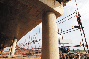 海口市龙昆南延长线立交桥项目建设工地上,工人们正在紧张施工,整个立交高架桥雄姿初现。这个横跨海口绕城高速的立交高架桥计划今年底建成通车。 本报记者 张杰 摄
