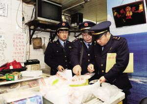 11月29日,工商执法人员在西三街水产品市场查获部分商家销售的合成鱼翅、仿真鲍鱼为三无产品。 当日,重庆市工商局执法局连同主城区6个分局的执法队员,对西三街、盘溪、三亚湾三个大型水产品市场进行突击检查,查处和没收了部分商家销售的“三无”合成鱼翅、仿真鲍鱼290余袋,折合金额近万元。 新华社发