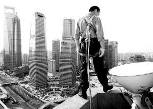 | 一名外来务工者准备在上海浦东新区的一幢高层建筑上进行外立面清洁作业。 |
