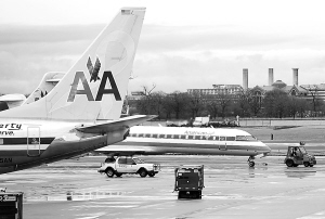 11月29日,美国航空公司一架班机降落在美国首都华盛顿里根机场。 美国航空公司及其母公司AMR公司当日申请破产保护,意在通过重组以减少债务负担、降低成本。 新华社记者 张军 摄