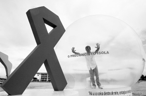 | 巴西普拉纳尔托宫前的塑料大球表现艾滋病人被孤立于社会。
