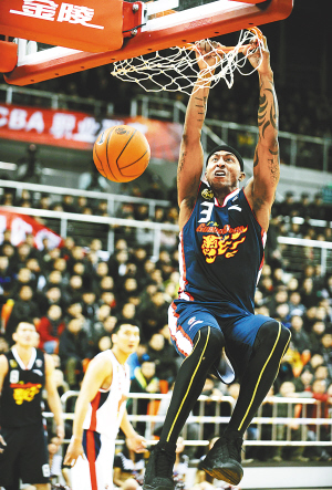 11月30日,在CBA第五轮比赛中,卫冕冠军广东东莞银行队爆冷以94:104不敌青岛双星队。图为广东队球员辛格尔顿扣篮。 新华社发