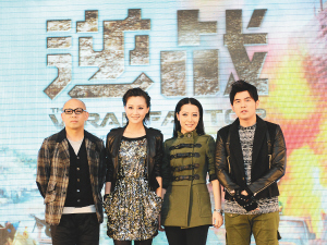 11月30日,斥资近两亿元的枪战片《逆战》在北京举行终极预告片发布会。图为导演林超贤携主演林鹏、白冰和周杰伦(从左至右)出席 该片将于2012年1月19日在全国上映。 新华社发