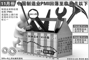 调查显示,11月份,构成制造业PMI的5个分类指数全部回落。其中,生产指数为50.9%,比上月回落1.4个百分点,表明制造业生产动力明显不足,增速持续放缓;新订单指数为47.8%,比上月下降2.7个百分点,跌入临界点以下,为2009年2月以来新低,显示制造业新订单数量减少,实体经济增长明显放缓。