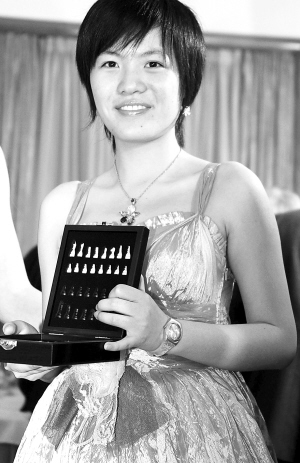 11月30日,2011年女子国际象棋世界冠军对抗赛闭幕式暨颁奖晚会在阿尔巴尼亚首都地拉那举行。图为蝉联“世界棋后”的中国棋手侯逸凡在颁奖晚会上。 新华社发
