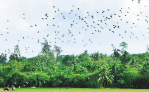 11月30日,成群的白眉鸭、绿翅鸭在海口市美兰区山尾头村湿地上空盘旋。 据介绍,入冬以来,每天都有成双结队的候鸟降临该湿地。今年来此越冬的野鸭数量超过去年,按以往经验,近期还会有大批不同种类的候鸟来此做客。该湿地与东寨港比邻,是鸟类栖息不可多得的重要湿地。 本报记者 苏晓杰 通讯员 陈伟 摄