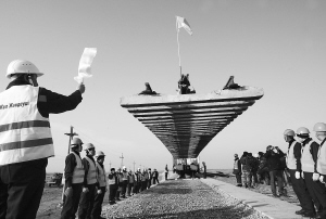 12月2日,一名中方铁路工人正在指挥铁轨铺设。 当日,中国与哈萨克斯坦两国铁路成功在霍尔果斯(中方)———阿腾科里(哈方)实现对接。这是继新亚欧大陆桥中哈阿拉山口铁路线外,中国第二条向西开放的国际铁路通道。 新华社记者 赵戈 摄