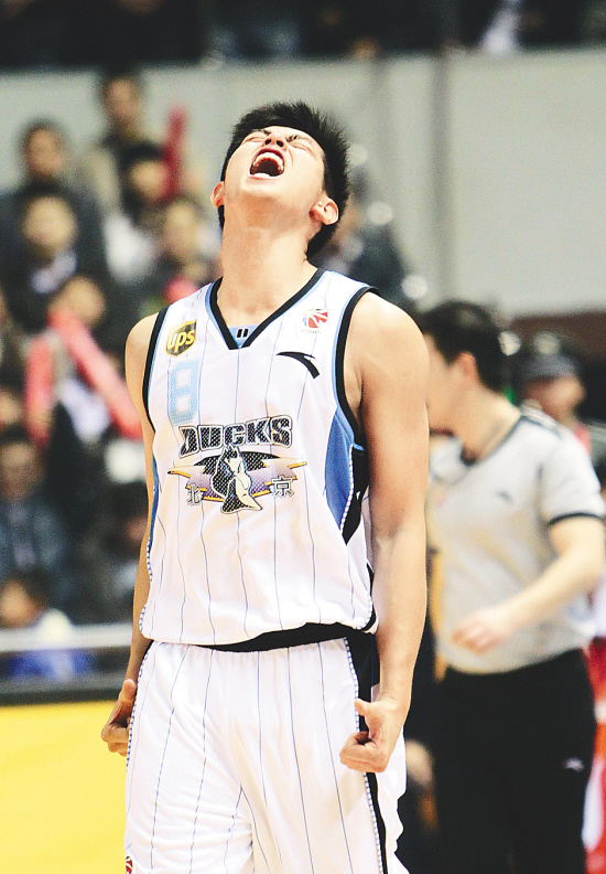 12月2日,在CBA联赛第六轮比赛中,北京金隅队主场以99:97战胜新疆沃尔沃队。图为北京金隅队球员方硕庆祝得分。 新华社发