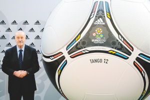 北京时间12月2日,2012年欧洲足球锦标赛决赛阶段官方比赛用球在乌克兰首都基辅揭晓。图为西班牙队主教练博斯克与比赛用球合影。 新华社发