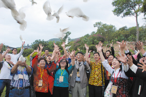 2007年11月,参加“两岸媒体海南行”活动的媒体记者在三亚南山寺放飞和平鸽