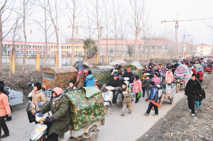 | 校车侧翻事故之后,家长用电动三轮车等接送子女。 新华社发 |