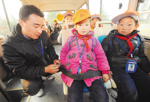 12月14日,长兴县和平镇中心小学的随车老师邹德建(左)给乘坐校车的孩子们系好安全带。 从2007年初开始,浙江省长兴县就率先在全国县一级政府成立由安监、交通、公安、教育等多部门组成的“学生接送车联合管理办公室”,由教育等各相关部门及乡镇政府管理和协调学生专用接送车。学生车管办成立5年来,县、乡镇各级政府累计投入专项资金2000多万,用于校车购买、日常维护、油料及驾驶员工资等。 新华社记者 徐昱 摄