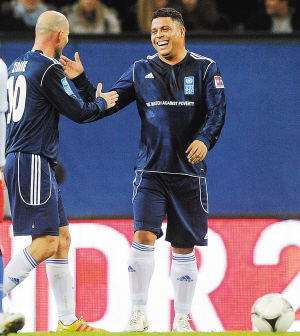 12月13日,在德国汉堡举行的“反贫穷义赛”中,代表国际全明星队出场的罗纳尔多(右)进球后与队友齐达内庆祝。国际全明星队以5:4战胜汉堡全明星队。新华社发