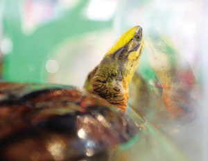 | 冬交会展馆,一只金钱龟探出头看着外面的世界。冬交会展出的金钱龟,单只最高价值达到40万元。 |