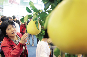 12月14日,冬交会琼中馆,柚子树上硕大的果子很诱人。