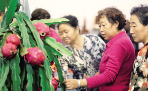 | 12月14日,冬交会琼海馆,火龙果活植株吸引了不少参观者。 |