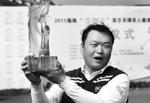 | 12月18日,周笑天夺得2011海南“金椰子”高尔夫球名人邀请赛总杆冠军,捧起“金椰子”杯。 本报记者 苏晓杰 摄