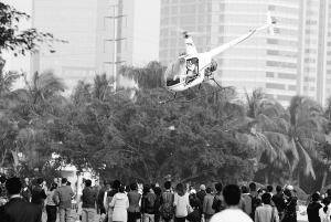 | 12月18日,在海口万绿园,海口市民在观看环海南岛飞行拉力赛直升机飞行表演。