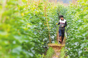 | 自己租地种菜,成为一些城里人的梦想。图为临高美所村万亩瓜菜基地一名蔬菜专业合作社社员在给节瓜进行人工授粉。