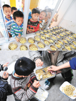 上图:9月1日,在广西都安瑶族自治县三只羊乡小学,学生们在排队领取免费营养午餐。下图:3月24日,在广西都安瑶族自治县三只羊乡小学,几名小学生在操场上吃黄豆拌米饭。
