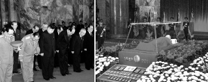 报道说,在悲壮的哀乐声中,金正恩同志与朝鲜党、国家和军队领导人一起,在金正日的遗体前默哀,表示最沉痛的哀悼。锦绣山纪念宫庄严肃穆,金正日的灵柩安放在花丛中,遗体上覆盖着红旗。灵柩前是朝鲜民主主义人民共和国国徽和“1942—2011”的年代标志,同时陈放着金正日生前获得的各种勋章和奖章。