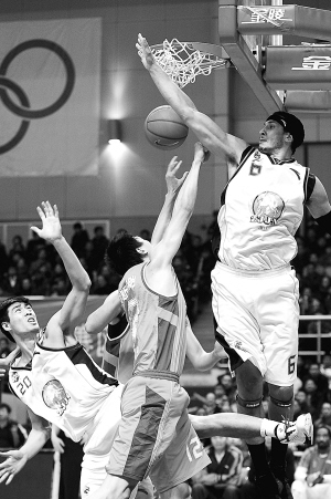 CBA联赛 浙江队胜上海队 20日,在中国男子篮球职业联赛(CBA)第14轮比赛中,浙江队主场通过加时赛以89∶86战胜上海队。 图为浙江队球员布恩(右)在比赛中封堵对方球员上篮。 新华社发