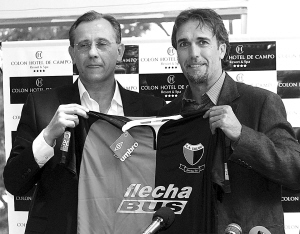 任阿根廷科隆俱乐部主管 20日,阿根廷“战神”巴蒂斯图塔重返足坛,出任阿根廷科隆俱乐部的球队主管。图为巴蒂斯图塔(右)出席阿根廷科隆俱乐部的推介会。 新华社发